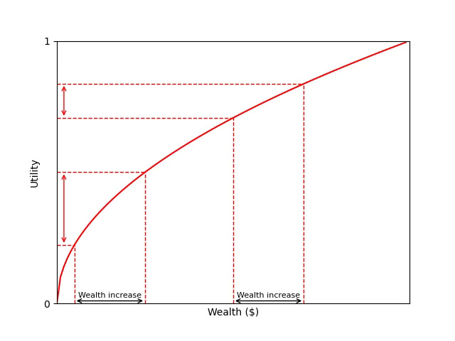 The key insight: the same amount of money provides diminishing utility as our wealth increases. Winning 100€ feels amazing when you have 50€ (tripling your money), but you barely feel it when you have 10,000€ (just a 1% increase).