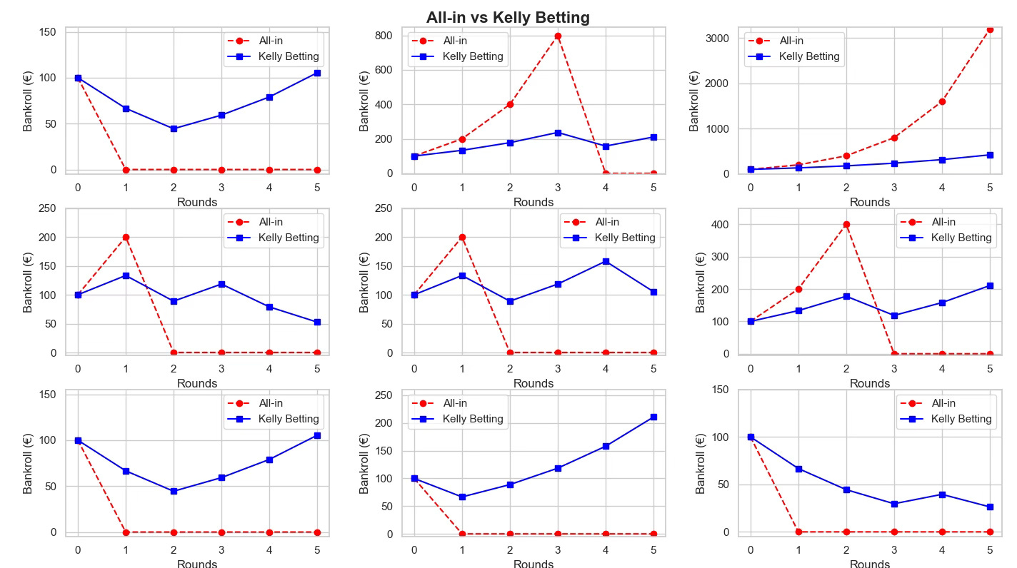 However, in the one simulation where a 5 or a 6 never showed, the all-in player made an astronomical 3,000€—far more than Kelly's modest 420€.